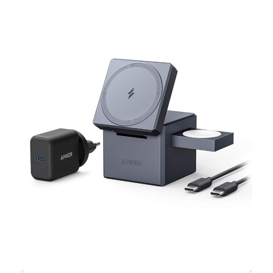 The Anker 3-in-1 Cube with Qi2 – Y1811KA1 is a compact, premium wireless charging station designed specifically for Apple ecosystems, featuring Qi2-certified technology for fast, efficient, and simultaneous charging of your iPhone, Apple Watch, and AirPods (with wireless charging case) in a sleek cube form factor. It delivers up to 15W fast wireless charging for compatible iPhones (iPhone 12 through 17 series) via magnetic alignment that ensures perfect placement and secure hold, similar to MagSafe, while providing optimized 5W charging for the Apple Watch (including fast charging for supported models) and 5W for AirPods. The cube’s innovative adjustable design allows customizable viewing angles for the iPhone in vertical or horizontal orientation, making it ideal for desk use, video calls, or bedside charging without taking up much space. Ultra-compact and travel-friendly with a premium build, it includes a USB-C input (often bundled with a cable and compatible adapter in many packages), supports safe multi-device charging without overheating concerns, and offers broad compatibility with recent Apple devices like iPhone 16/15/14/13/12 series, Apple Watch Series 10/9/8/Ultra, and AirPods Pro/2/3/4 generations. This makes it a stylish, reliable all-in-one solution that streamlines your charging setup at home, office, or on the go, backed by Anker’s reputation for quality and often a standard warranty.