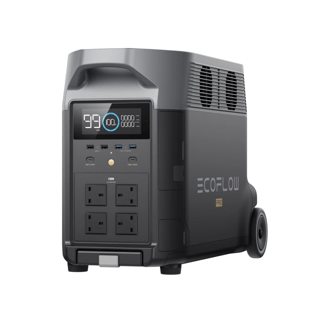 The EcoFlow DELTA Pro (DELTAPRO-UK-C20) is a high-capacity, expandable portable power station engineered for whole-home backup, off-grid living, RV use, and heavy-duty power needs in the UK/EU market, combining massive energy storage with versatile output and fast recharging. It features a robust 3600Wh LiFePO4 battery (rated for 6500+ cycles to 50% capacity or up to 3500 cycles to 80% for longevity), delivering 3600W continuous AC output (7200W surge/X-Boost for resistive loads) across four AC outlets (UK Type G plugs, 230V~13A), plus USB-A (2 fast-charge 18W + 2 standard), USB-C (100W PD), DC5521 ports, a 12.6V car port, and a 30A Anderson port for high-power connections. The station supports ultra-fast multi-charging up to 6500W (AC + solar + generator/car), recharging fully in as little as 1.9–2.7 hours depending on input (1800W–3000W AC max), with 1600W solar input capability (high-voltage MPPT for efficient panel arrays). Expandable up to 25kWh by stacking additional DELTA Pro units, Smart Extra Batteries, or Smart Generators, it includes a <30 ms UPS switchover for uninterrupted power to critical devices, app control via Bluetooth/Wi-Fi for monitoring, customization, and smart energy management, and quiet operation (<50 dB under load). Weighing approximately 45 kg (99 lb) with built-in wheels and telescoping handle for portability, the rugged design (IP54 weather-resistant in some modes) makes it suitable for indoor/outdoor use, powering 99% of appliances from fridges and tools to EVs/RVs—offering a scalable, future-proof solution for blackouts, lower energy bills, and independent power with a 5-year warranty.