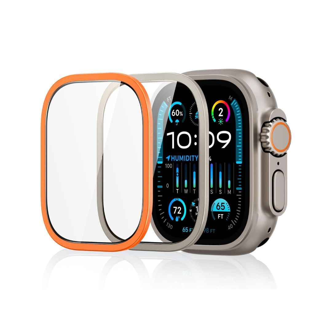 A sand-blasted premium aluminum alloy or stainless-steel frame surrounds the tempered glass, designed to blend perfectly with the titanium bezel of the Apple Watch Ultra. This frame enhances structural integrity, prevents lifting at the edges, and gives the protector a high-end, integrated look that complements the watch’s premium design.