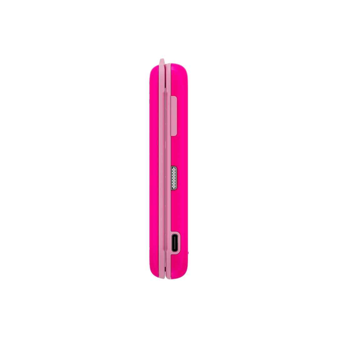 The HMD Barbie Flip Phone revives the classic flip phone form factor with a glossy Power Pink finish that instantly evokes Barbie’s signature style. The exterior doubles as a subtle mirror when the screen is off, while opening it reveals a bright 2.8-inch inner display and a 1.77-inch external screen for quick glances at notifications or the time. Interchangeable back covers, sparkly stick-on gems, retro stickers, and a beaded lanyard with charms like roller skates and ice cream cones allow full personalization to match any Barbie-inspired aesthetic.