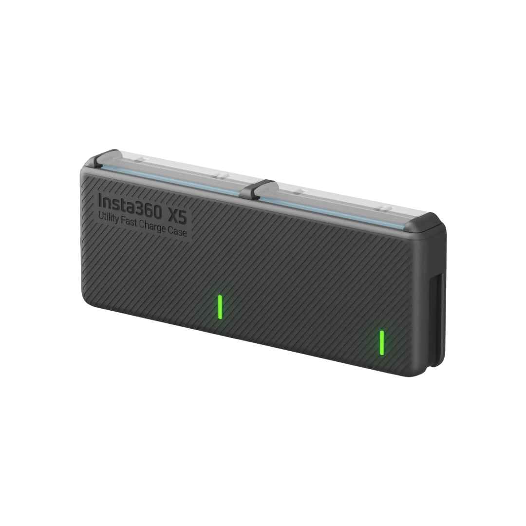 The Utility Fast Charge Case uses USB-C Power Delivery to charge one Insta360 X5 battery to 80% in just 28 minutes and fully in about 38 minutes. It can charge two batteries in the case and one in the camera simultaneously, minimizing downtime for creators during shoots.