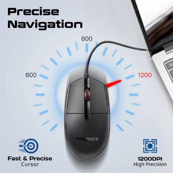 he Promate CM-1200 Ergonomic Design Wired Optical Mouse is built for reliability, comfort, and smooth navigation. Its contoured design ensures a natural grip that minimizes strain during extended use, while the high-precision optical sensor delivers accurate tracking on most surfaces. Perfect for both office tasks and casual use, this mouse combines simplicity with efficiency.