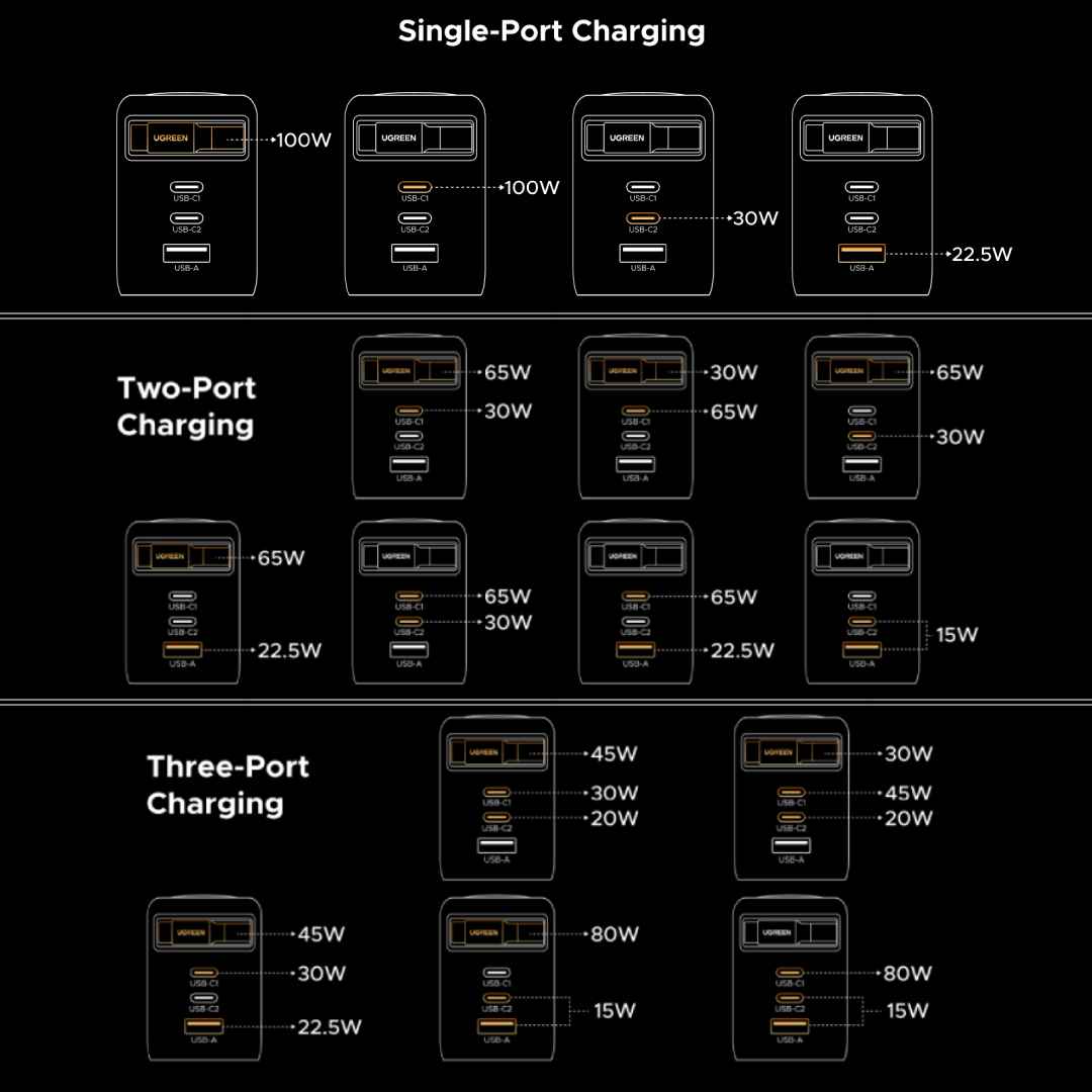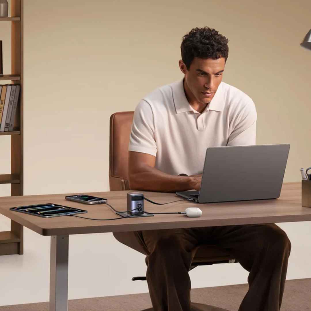 The Nexode delivers a full 100W from a single USB-C port when only one device is connected—enough to fast-charge a 14-inch MacBook Pro at maximum speed. When multiple devices are plugged in, it dynamically distributes power (e.g., 65W + 20W + 15W) so every gadget charges as quickly as possible without slowdown.